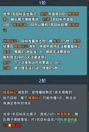 该角色的一技能是朝攻击的目标丢出扇子,可以达到禁疗和200%输出的效果,后续能灼烧3个目标,并且造成200%的伤害,同时还会随机给一个目标叠加标记,被标记的目标准备攻击的时候是会被魅惑1.5秒的。