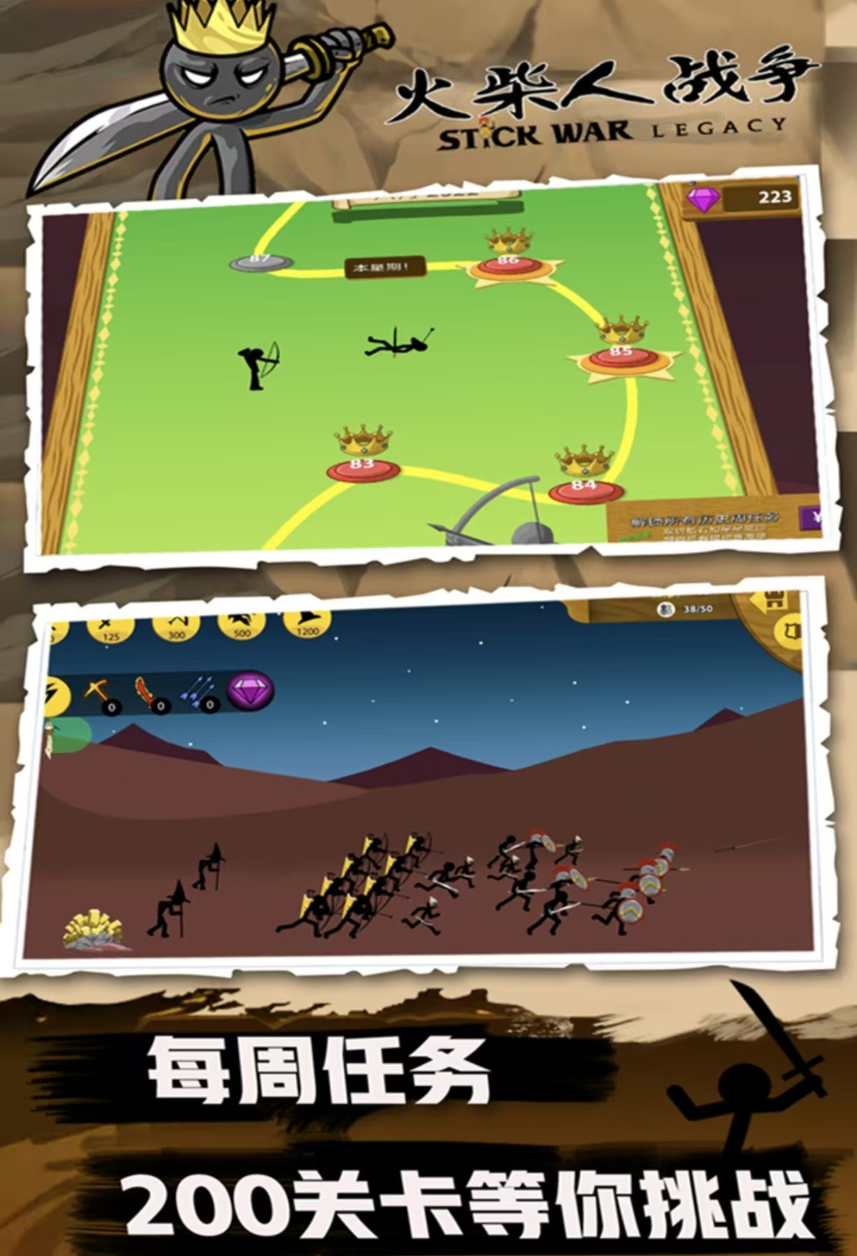 《火柴人战争》为即时策略类单机游戏,聚焦火柴人士兵单位编队与战术部署。玩家需组建弓箭手、法师、战士等兵种协同作战,对抗多类型僵尸敌人。各兵种拥有独特攻防属性与技能机制,战场地形影响视野与走位策略,敌方单位具备差异化移速与血量阈值,需针对性配置阵型与技能释放时机。战役模式包含主线推进与隐藏挑战,角色外观支持皮肤切换,不影响战斗数值。