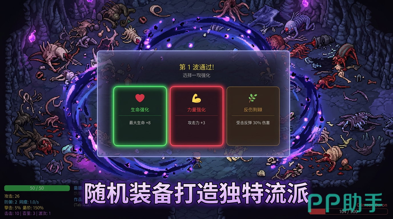 战斗采用波次推进机制,节奏紧凑、反馈直观。每轮结束后,玩家可自主决定属性成长路径,灵活适配不同敌人类型——例如面对高爆发法师型Boss时优先堆叠生命与反伤,对抗物理系群怪则侧重力量与持续输出。这种动态养成体系,让每一次通关都成为独一无二的成长轨迹。
