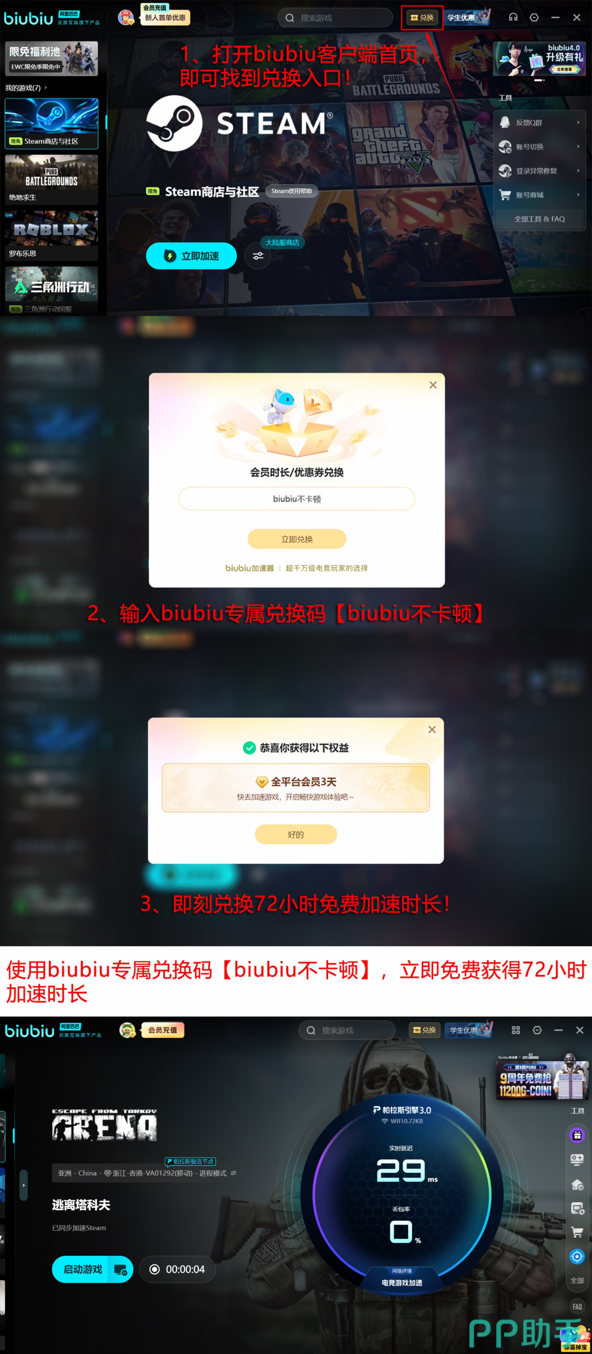 当前开放两项限时福利:新注册用户完成账号激活后,可即时领取24小时全功能试用权限;所有用户输入兑换码【biubiu不卡顿】,即可激活3天连续加速服务。两项权益可叠加使用,新用户最高可获得总计96小时的免费加速时长。