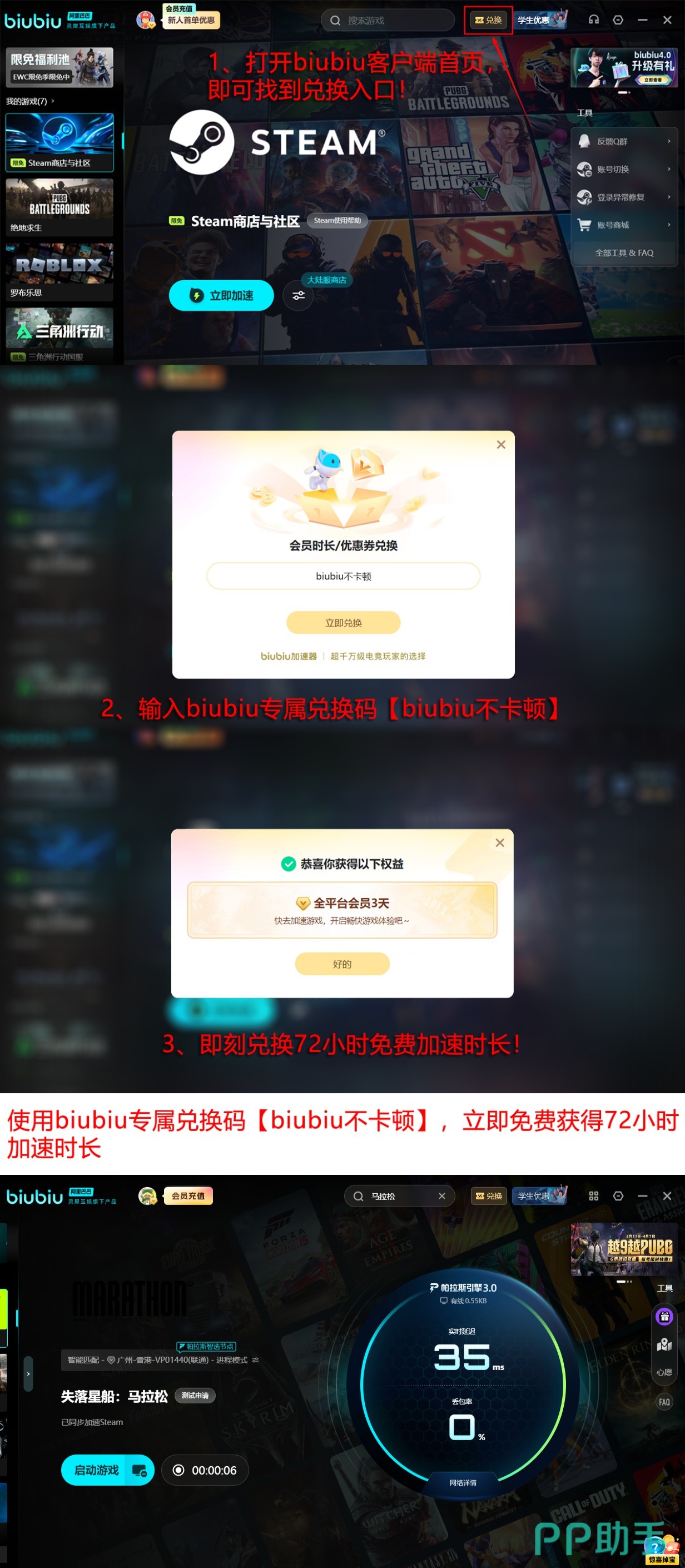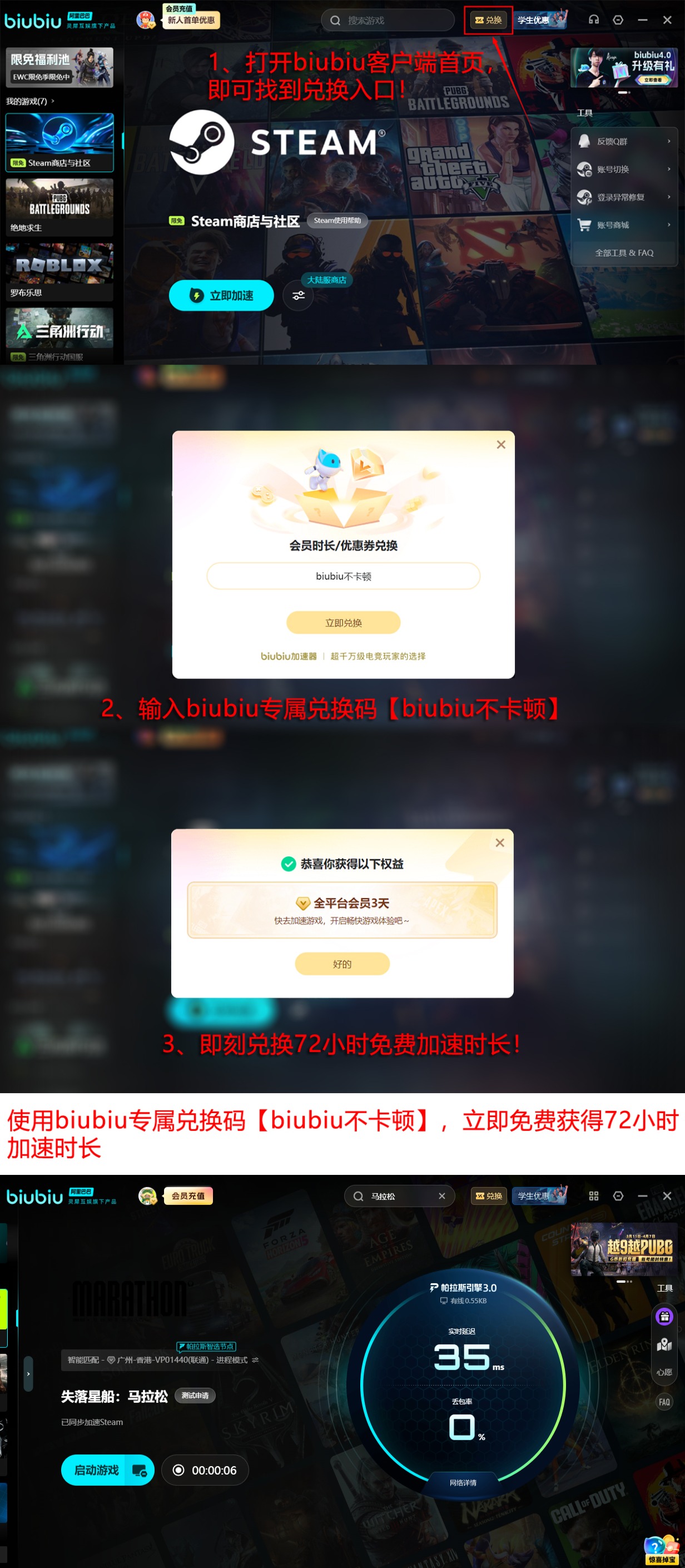 目前新注册用户可直接领取24小时全功能试用权限。此外,所有用户(含老用户)均可通过客户端首页“兑换中心”输入专属口令【biubiu不卡顿】,额外获得72小时加速时长,且该权益可与新用户赠送时长叠加使用,总计达96小时。相比因网络异常中断对局、影响段位晋升或团队战绩,投入合理成本获取持续稳定的竞技环境,已成为越来越多玩家的共识。