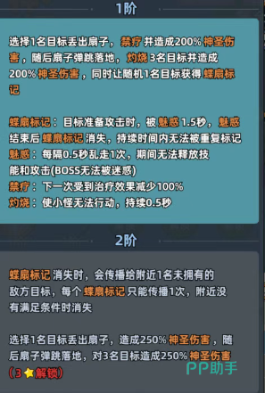 一技能【烈扇焚心】:向指定敌方单位投掷火焰折扇,造成200%攻击力的初始伤害,并施加禁疗效果;随后对周围最多3名敌人触发灼烧,每段造成200%攻击力的持续伤害;技能释放后,随机选取一名敌人叠加【魅惑印记】,该目标下次普攻将被强制转向并延迟1.5秒发动。