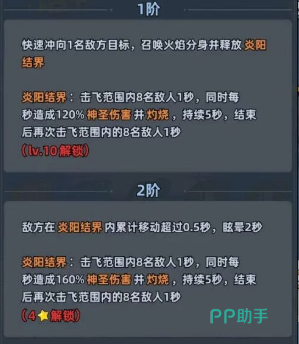 二技能【焰影突袭】:瞬移至单个敌方目标位置,召唤火焰分身协同攻击,对范围内所有单位造成120%攻击力的伤害并附加5秒灼烧效果;同时击飞目标1秒;技能效果结束后,范围内单位再次受到1秒击飞判定。
