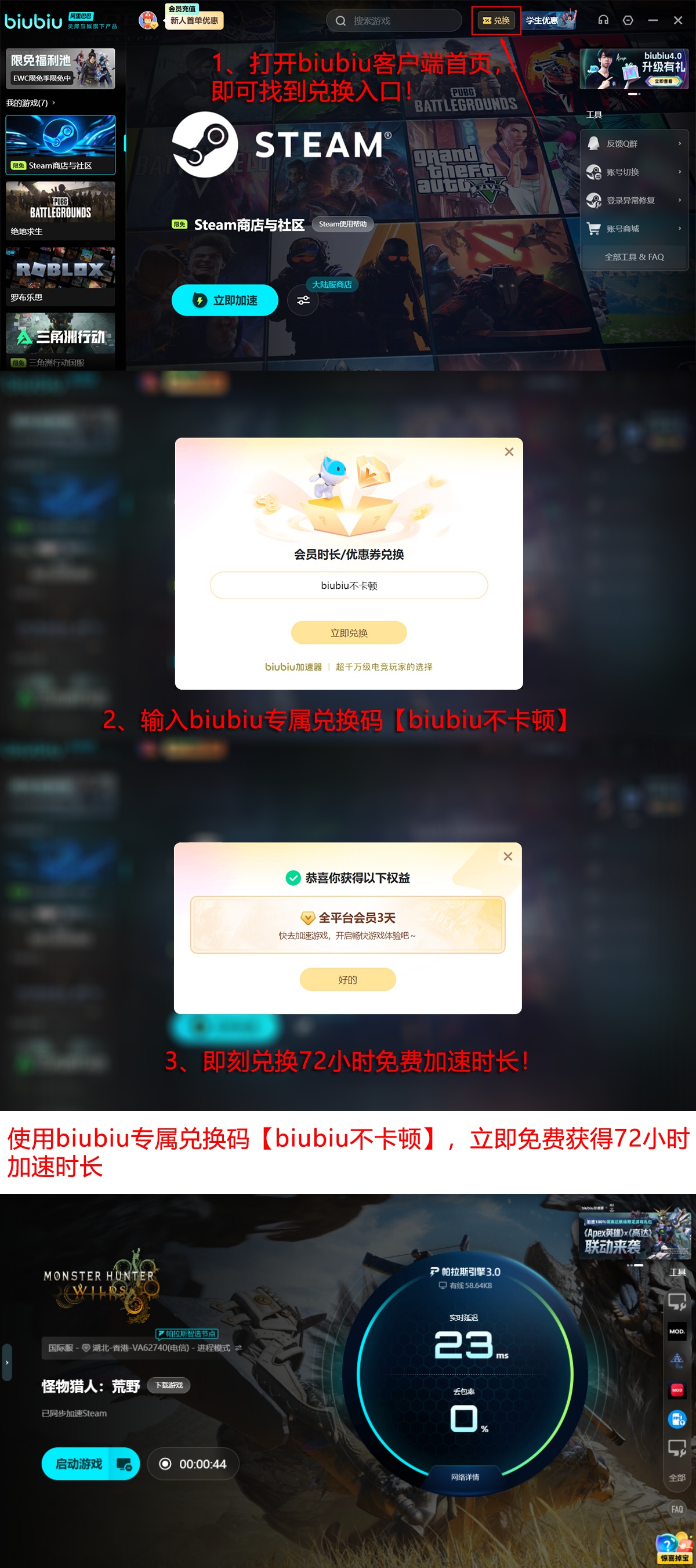 对于学生群体,biubiu提供零门槛体验方案:新用户注册即赠24小时全游戏加速权限;完成基础任务后,可在首页兑换入口输入激活码【biubiu不卡顿】,额外获得72小时服务时长——新老用户均可参与,累计达96小时。后续付费套餐同步开放教育认证优惠,支持按日/周/月灵活订阅,降低长期使用成本。建议先通过免费时长验证实际优化效果,再决策是否升级服务。