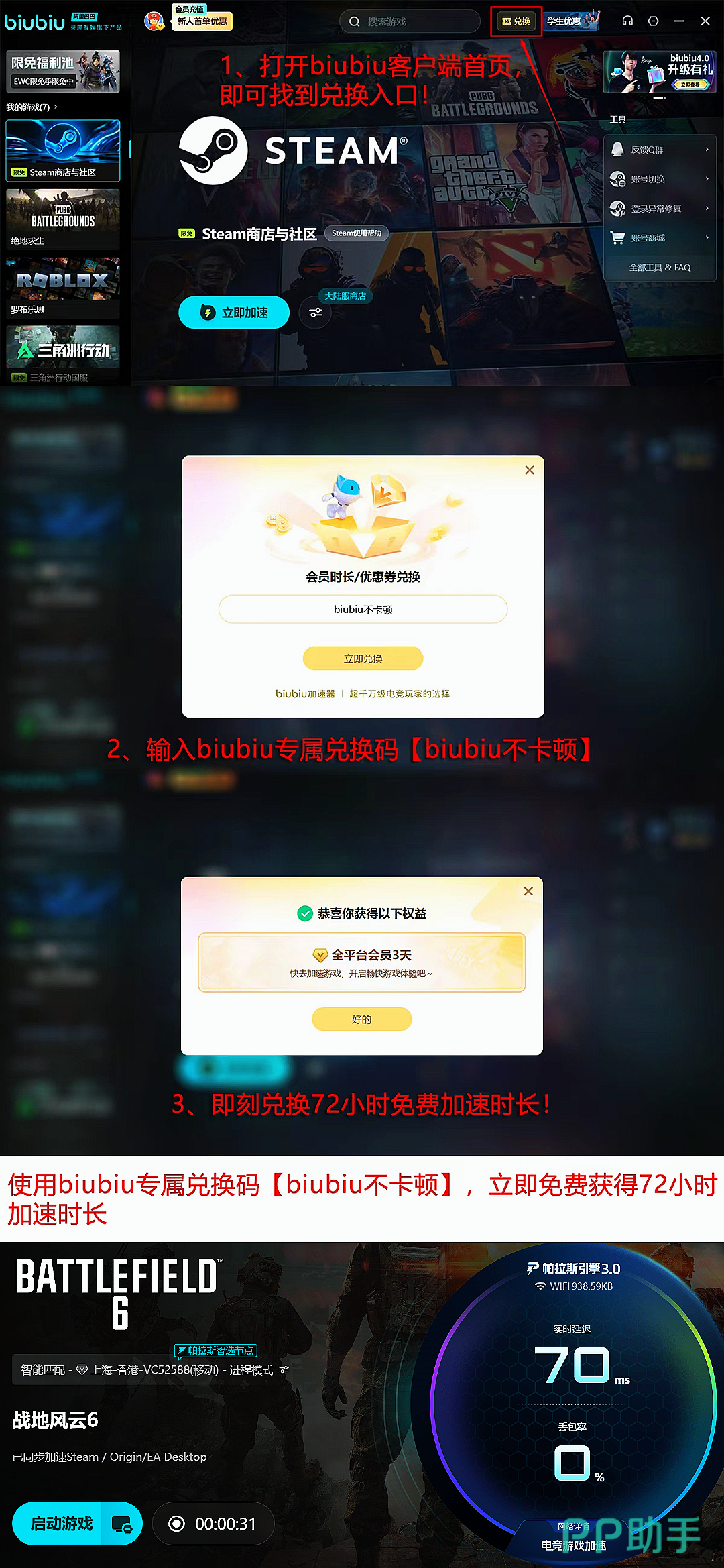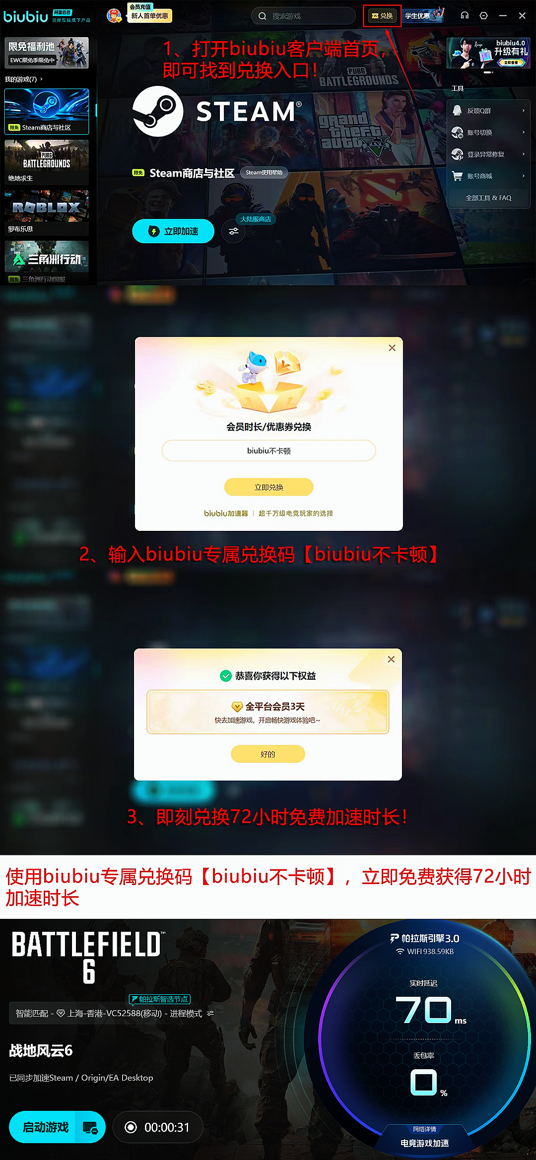 新注册用户可立即获得24小时全游戏免费加速权限,不限速、不设设备数限制;另在兑换中心输入口令【biubiu不卡顿】,可额外领取3天加速时长。两项权益支持叠加使用,新用户最高可享96小时连续加速服务。