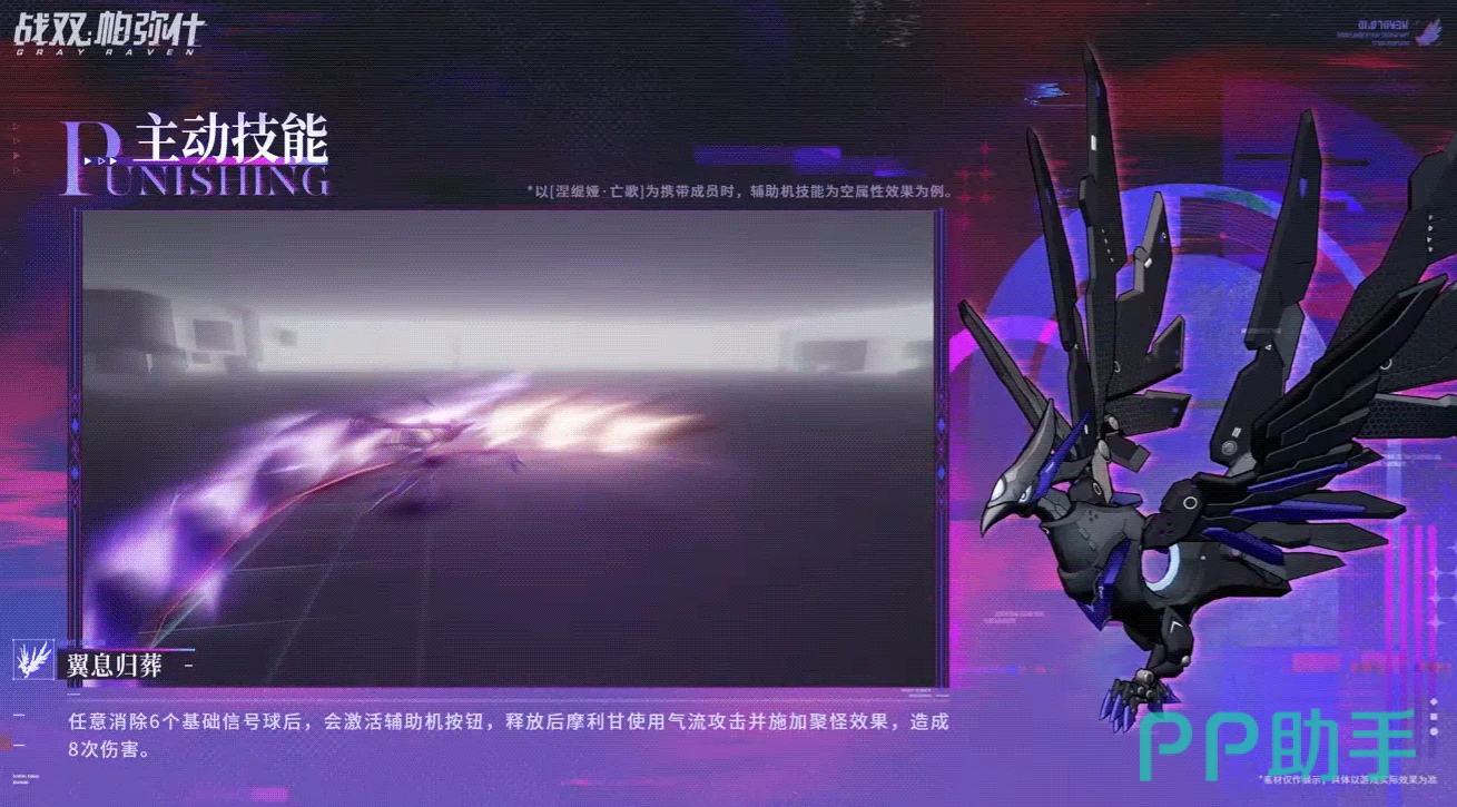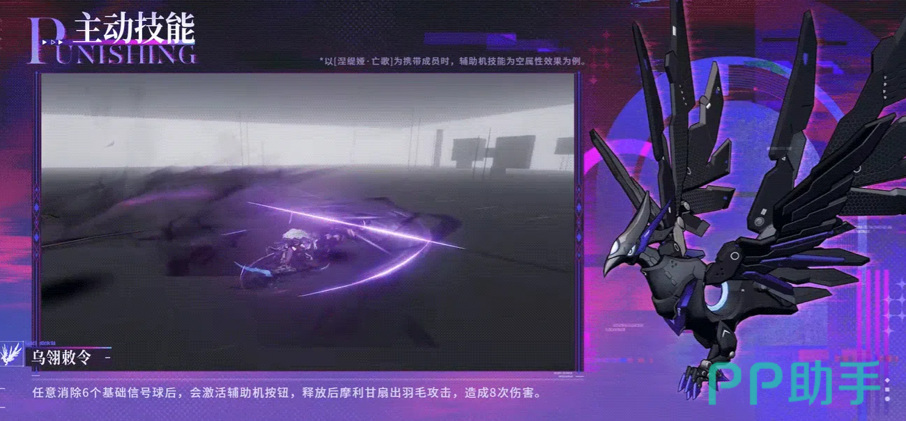 主动技能方面,摩利甘有两个可以选择。乌翎敕令的触发条件,是消除任意6个基础信号球,激活辅助机按钮之后释放,摩利甘会扇出羽毛进行攻击,总共打出8次伤害,这个技能偏向于单纯输出,打出去的伤害比较集中。