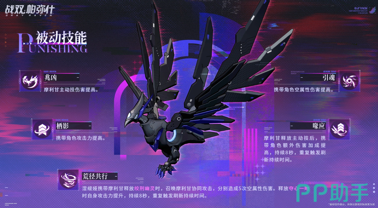 被动技能这块,摩利甘一共有五个。兆凶这个被动,作用是提升摩利甘自身主动技的伤害,简单来说,就是打出去的主动技会更痛一些。引魂的效果是提升携带角色的空属性伤害,如果队伍里有空属性输出角色,带上摩利甘之后,伤害会有一定幅度的提升。栖影则是直接给携带角色加攻击力,不需要什么触发条件,上场就有效果。喙应稍微复杂一点,摩利甘每次释放主动技之后,携带角色的额外伤害加成会提高,这个效果持续8秒,如果在8秒内再次触发,持续时间会重新刷新,不会叠加,但也不会浪费。荒径共行是摩利甘和涅缇娅之间的专属联动被动,涅缇娅带着摩利甘释放绞刑幽灵的时候,摩利甘会跟着一起出来打,分别造成5次空属性伤害。另外涅缇娅释放夺心一吻的时候,自身攻击力会提升,同样持续8秒,重复触发可以刷新时间,这个被动对涅缇娅的提升很明显,基本上是专属增益。