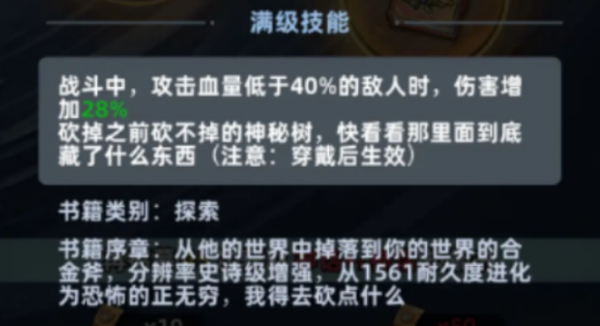 更关键的就是专属的技能,在穿戴之后就可以砍掉之前怎么都砍不动的神秘树,打开隐藏的探索区域。在战斗中攻击血量低于40%的敌人时,还可以额外的提升28%的伤害。挖资源之余,还可以当战斗辅助,实用性是比较不错的。而且它的耐久性确实很不错,堪称恐怖,从初始的1561在进化之后就可以直接接近无限。根本就不需要频繁的更换,确实有一些省心省力。末日生存讲究的就是实用和效率,道具的选择也是如此。大家一定要掌握以上的获取方法。
