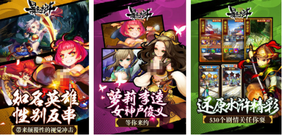 将策略卡牌以及角色扮演的玩法深度融合,完美还原了水浒当中的经典故事剧情,还有精美的人物角色,在108位梁山好汉当中进行了性别的反转,这也是属于独具特色的创新机制,就比如特别暴力的李逵变成了特别可爱的萝莉少女。但这些英雄中却秉持着属性相克的机制,采用九宫格的站位方式,就能够形成不同的效果。