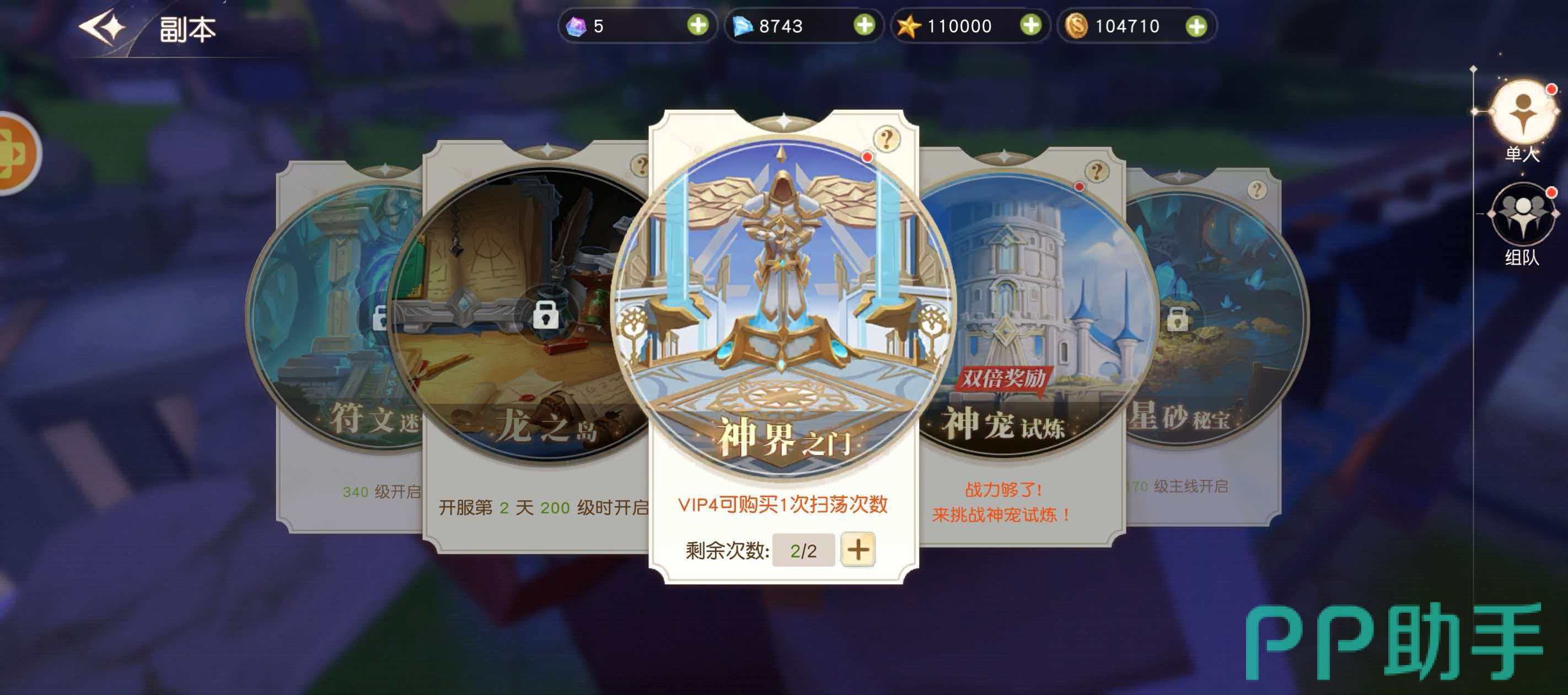 玩家若是想要获取钻石的话,那么就必须挑战晶石山脉,这个副本可以给玩家们提供稳定的钻石来源,单人副本中的神界之门只要用来获取培养天神的资源,神宠试炼是专门给宠物准备的竞技场,只要宠物的战斗力够了就能够挑战,星砂秘宝可以让玩家获得重要的交易货币星砂。