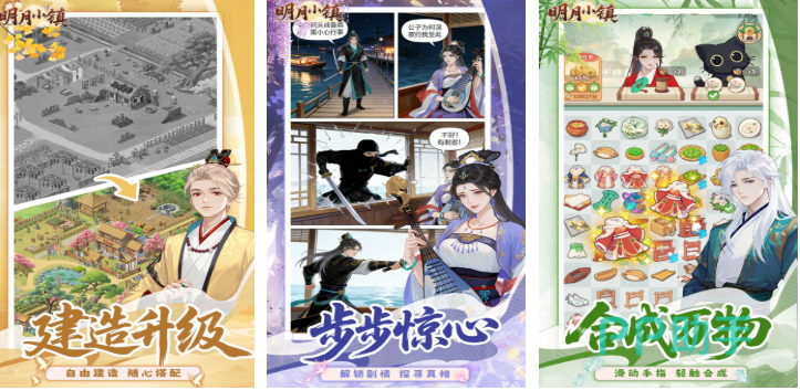 以中国古代市镇为蓝本,融合建造、合成与剧情推进三重玩法。玩家需收集木材、石材、布匹等基础资源,通过工坊合成高级建材,逐步扩建府衙、医馆、书院等标志性建筑。主线任务穿插民间传说与历史典故,对话选项影响NPC好感度与支线开启条件。