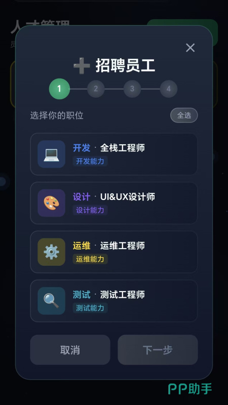 每一个候选人都会有五维能力属性,大家要根据项目的需求,还有预算去选择。用合理的成本去组建核心的团队,而且不能招完就不管,随时都要定期的提升他们的能力,合理的分配岗位。否则员工的士气低落,也会影响到项目的研发效率。项目研发则是游戏的主线玩法,从策略到开发,再到后期的发布,每一个环节都需要亲力亲为。玩家可以选择开发工具软件,电商平台,不同项目的研发周期和收益都是有所区别的,考验的就是玩家的商业目光。