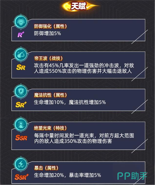 卢卡尔的天赋分别是防御强化、绝望光束、帝王波、暴击、魔法抗性以及生化屏障上,防御强化会让卢卡尔的防御力增加5%,帝王波则是一个能够发射出队敌人造成550%物理伤害并附带上击退效果的冲击波,该能力也是卢卡尔的另一个核心技能,针对该技能,玩家们需要选择待用控制技能的角色,在该技能没用之前就把他给先控制住,否则后期就不好打了。
