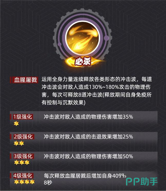 卢卡尔是一个各方面属性都非常高的角色,这个角色的技能在战斗时还有着极为特殊的能力,血腥屠戮作为卢卡尔的主要技能,实用该技能以后,他将会用全身的能量释放出强大的冲击波,每一道冲击包所造成的物理伤害都在140%-190%期间,而且每一次释放出的冲击波数量高达8道,,同时冲击波在释放的期间还附带上了沉默效果以及免疫免控的能力,当血腥屠戮的等级给强化道3级以后,冲击波还会产生三种不同的效果,分别时窃取敌人20点的怒气、触发穿透效果,对1名敌人造成伤害以及给敌人造成150%的真实伤害,注意,这三种效果不是同时出现的,是出现其中一种,应对血腥屠戮技能的方法也很简单,就是在卢卡尔准备释放该技能之前,直接将该技能给打断,若是没有及时打断该技能的话,那玩家就必须有强大的输出能力来对抗该技能。