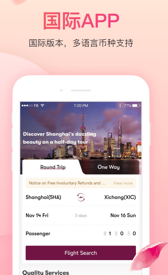 四种语言版本切换,国际航线预订时自动匹配当地币种,出境旅客支付时不用再手动换算。提前48小时在线选座值机,座位图可以预览,靠窗还是靠过道,多人同行一次全部办完。如意会员积分可以累积兑换,定期有免票活动,会员日的专属福利也不定期推出。贵宾厅预订、境外WiFi租赁、行程单邮寄,这些出行附加需求都能在app内一并处理,不用另外找平台。