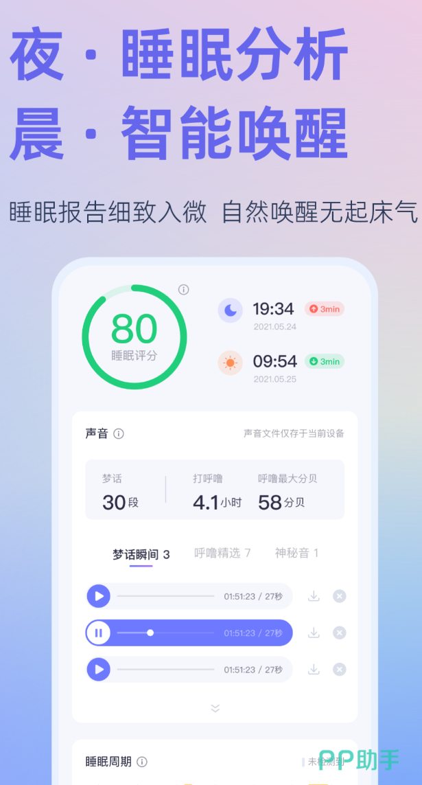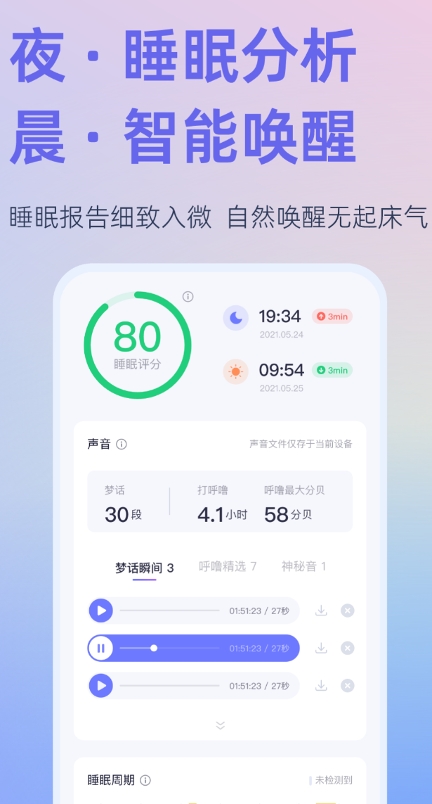 睡不着的时候,脑子偏偏转个不停,越想越清醒。小睡眠的曲库有1000多首原创助眠音频,白噪音、自然环境音、脑波音乐都有,三轨混音可以同时播放,组合方式多到几乎不会重复。内容由心理学背景的团队制作,经过专业审核,不是随便录几段声音凑数。睡眠监测用手机麦克风采集数据,分析深睡和浅睡的时间段,生成报告。