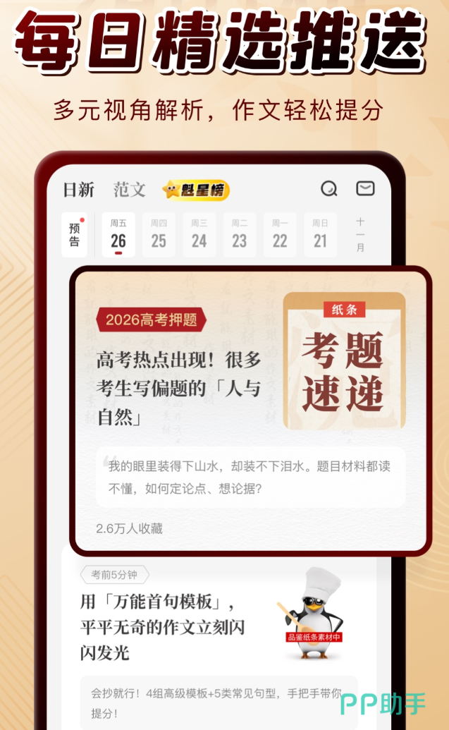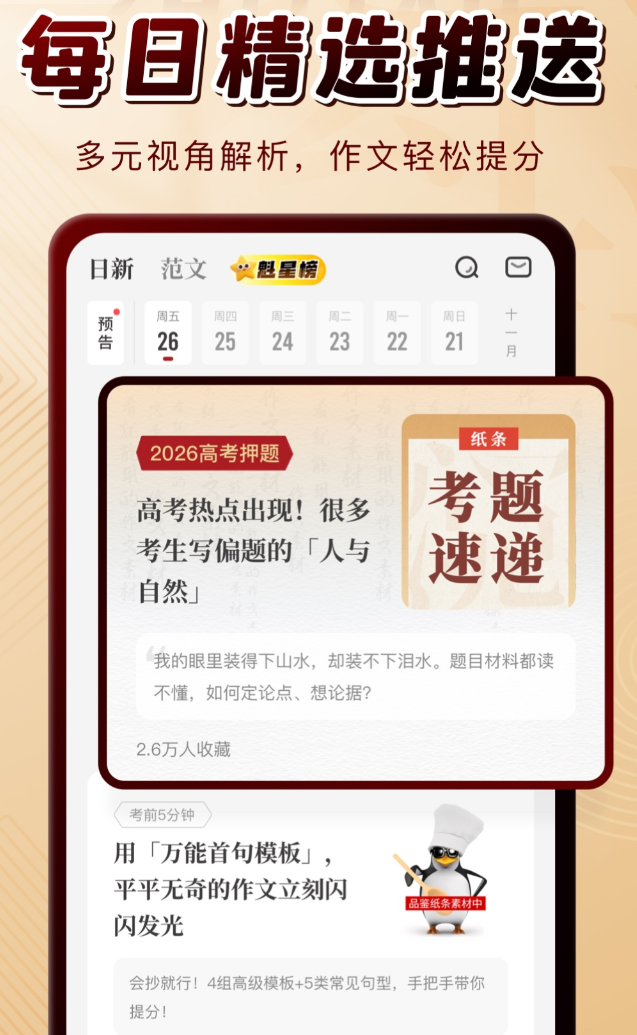 写作文最头疼的不是不会写,是脑子里没东西可写。纸条作文的素材库按中高考常见主题分了20多个类别,卡片正面是提炼好的要点,背面有主题说明和示例,翻一翻就能找到方向。搜索支持关键词,还能按短句、长文或主题筛选,不用一条条翻。备考功能专门针对考场写作,帮助学生在有限时间内找到得分点。
