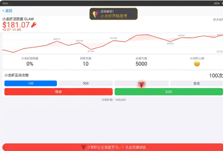 最厉害的就是小龙虾有一个AI智能脑回路,并不是死板的虚拟宠物,就好像是一个拥有自己想法的活宝一样。你要时刻关注他的心情,社交,饥饿,还有健康。你让他去炒股,他可能就会一顿操作猛如虎,但是最后亏的只剩底裤。你让他和女友聊天,他可能会把天聊死,还露出了委屈巴巴的样子。每一次的互动都会让人觉得很惊喜,并不存在任何重复的剧情,每一只小龙虾的性格是不一样的,养起来就好像开盲盒一样。
