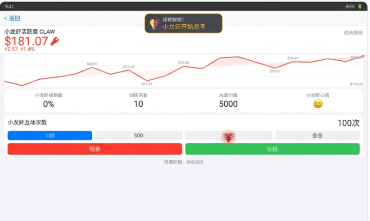 这一只小龙虾有什么独特的地方?那就在于拥有AI脑回路,行为完全是不可预测的。上一秒可能还在乖乖的进食,但是下一秒就会去炒股,就这么盯着虚拟K线图。当然也可能会沉迷网络,疯狂的在购物车里面加东西,等着你去买单,甚至还会模拟人类聊天,和网友一起去唠家常。偶尔还会闹一些小情绪,如果你忘了喂食,他就会用钳子去敲击缸壁,向你抗议。随着亲密度逐渐的提升,那么后期还会解锁更多的隐藏玩法,可以带着他去郊游。