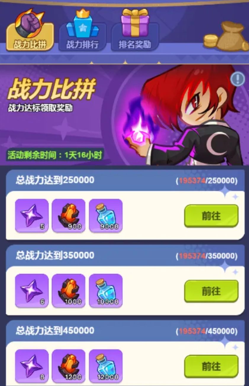 玩家需要注意比拼玩法,能够帮助玩家快速的提升战斗力,通常是按天数依次进行解锁,玩家此时需要记好时间。一旦玩家在开服的时候,第2天战斗力比拼,就能够让玩家拥有战斗力的同时,还能够获得对应的排名。如果玩家的战斗力达到25万、35万或者是45万的话,此时还将会获得福利。建议玩家一旦手中有资源的时候,就直接把所有的资源都放到核心角色方面,这样的话能够帮助核心角色冲战斗力。