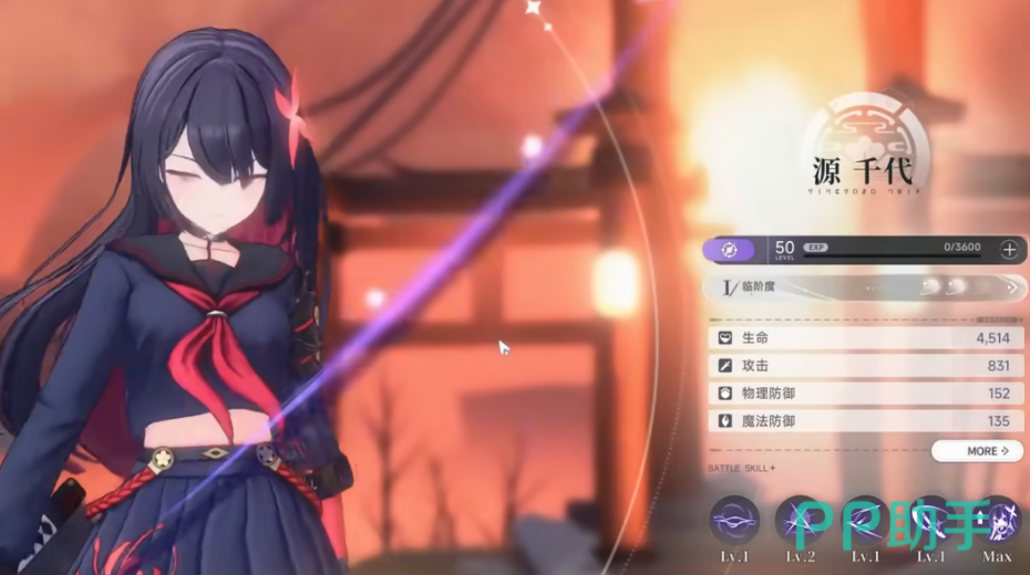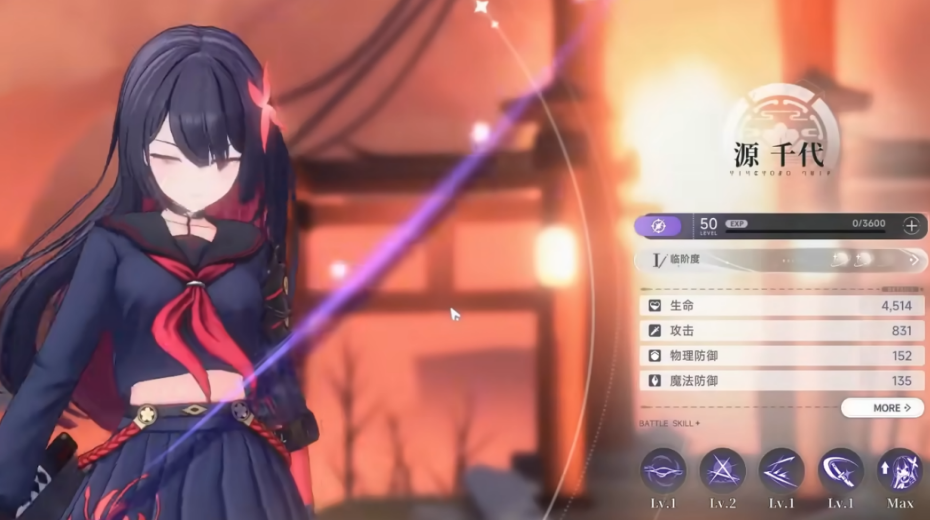 源千代是暗系太刀角色,输出上限是T0里最高的。她的普攻打满五段之后会积累"鬼火",叠满接重击,斩击倍率很高。她还有个留火区域的机制,站在区域里重击速度提升30%,这个加速效果对输出链影响很大。操作上有个技巧,闪避之后立刻接普攻,可以取消重击的后摇,让输出不断档。这个操作刚开始不太好掌握,但练熟了之后,伤害比普通打法高出不少。