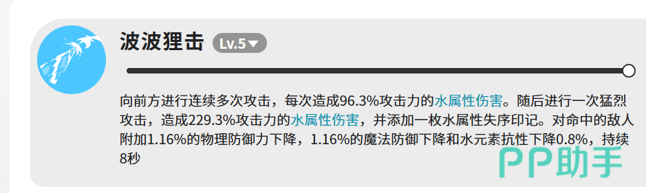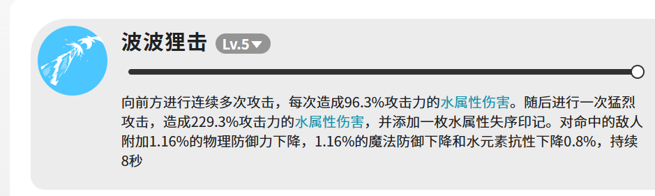 说回技能部分,波河狸一共有四个技能,分别是波波狸击、水弹、泡泡攻击和破碎激流。波波狸击是主要的输出手段。满级之后,它会先向前方连续打出多次攻击,每次造成96.3%攻击力的水属性伤害。连击结束之后,还会跟上一次重击,这一下伤害直接跳到229.3%攻击力,同时给目标加上一枚水属性失序印记。除了伤害之外,命中的敌人还会被附加减益效果,物理防御和魔法防御各下降1.16%,水元素抗性也会降低0.8%,这些效果持续8秒。单看数字可能觉得降幅不大,但在实际战斗里,配合队伍里其他水属性角色一起打,叠起来的效果还是挺明显的。