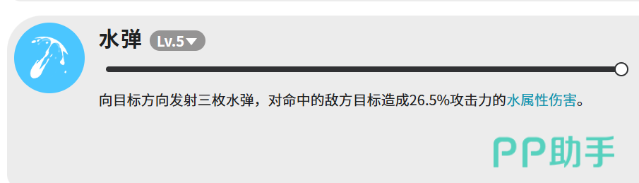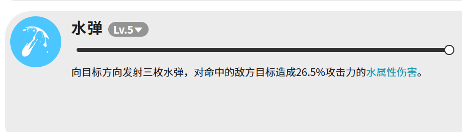 水弹相对来说比较简单,向目标方向射出三枚水弹,每枚命中造成26.5%攻击力的水属性伤害。伤害倍率不算高,但胜在操作简单,可以用来补刀或者在主技能冷却的时候填空档。