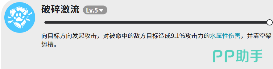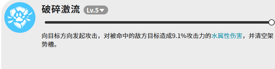 破碎激流这个技能比较特殊,伤害倍率只有9.1%,看起来很低,但它的作用不在于伤害本身。这个技能命中之后会直接清空目标的架势槽,这个效果在面对一些靠架势槽维持状态的敌人时,用处非常大。可以说是一个功能性技能,不能单纯用伤害数字来衡量它的价值。