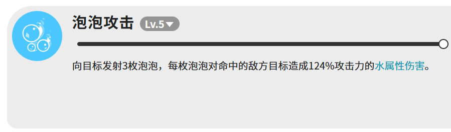 泡泡攻击的手感和水弹有点像,但伤害差距挺大的。同样是发射三枚,不过每枚泡泡命中之后造成的伤害是124%攻击力,比水弹高出不少。三枚全中的话,总伤害还是相当可观的,算是波河狸技能里比较稳定的一个输出来源。