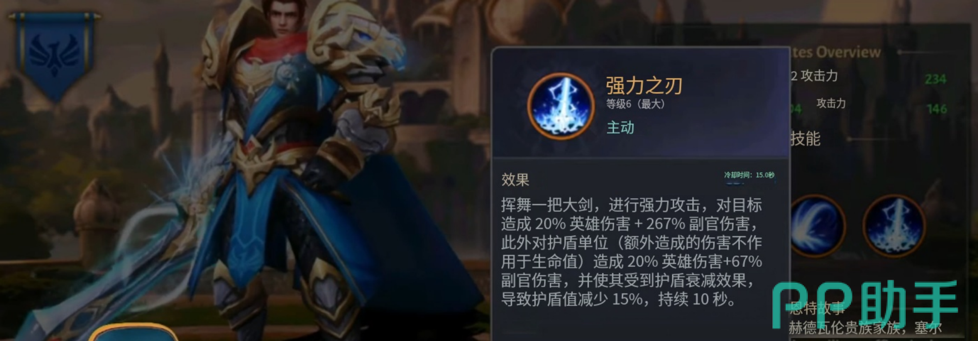 另外一项他的主动技能“强力之刃”具有很强的战术针对性。技能冷却时间15秒,挥舞大剑造成大量伤害,还可以破坏护盾单位。可以对带有护盾的敌人造成额外伤害,会降低敌方护盾值15%并持续10秒。目前版本中存在很多依靠护盾生存的敌人和Boss,查理爵士的破盾能力就更加宝贵了。该角色不但可以有效地破除敌人的防御,还可以给队友提供更好的输出环境。