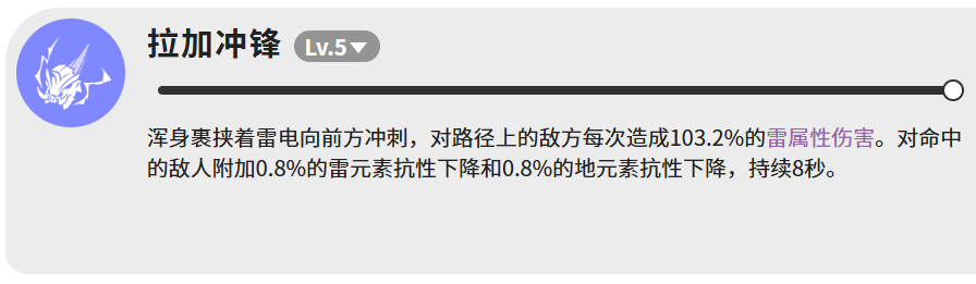 先说技能,拉加野猪一共有四个技能,每个都有自己的用途。第一个是拉加冲锋,等级5的时候,浑身带着雷电往前冲,对冲刺路径上的敌人每次造成103.2%的雷属性伤害。这个技能的特别之处在于,命中之后还会给敌人叠一个减抗效果,雷元素抗性和地元素抗性各降0.8%,持续8秒。单次减抗数值看起来不高,但如果多次命中,叠起来还是有点效果的,尤其是配合后面的技能一起用,伤害会更明显。