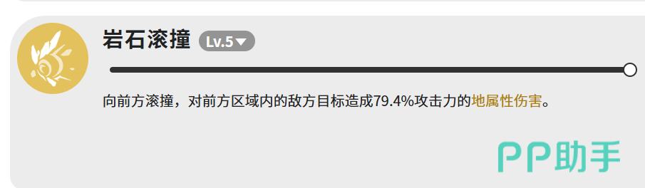 第三个是岩石滚撞,等级5造成79.4%攻击力的地属性伤害,向前方滚过去,打前方区域的敌人。伤害倍率在四个技能里算低的,但地属性输出本来就是辅助雷属性的,这个技能主要是补充地属性伤害,顺带打一下范围。