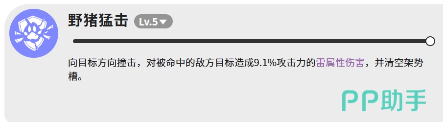 第四个是野猪猛击,等级5只有9.1%攻击力的雷属性伤害,数值很低,但这个技能的重点不在伤害,而是命中之后会直接清空敌人的架势槽。架势槽清空意味着敌人会进入硬直状态,这个时候接其他技能,伤害会高很多。所以野猪猛击更像是一个控制技能,用来打断敌人的节奏。
