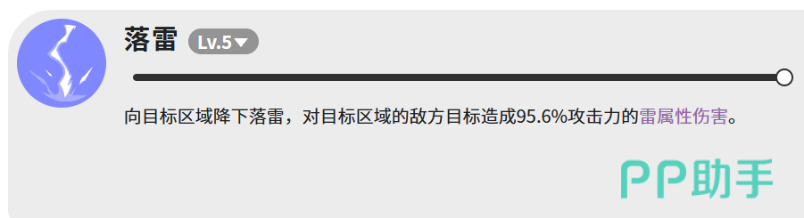 第二个是落雷,等级5造成95.6%攻击力的雷属性伤害,打的是目标区域,范围攻击。这个技能和拉加冲锋搭配起来用比较顺,冲锋先把抗性压下去,落雷跟上,伤害就能打得更高一些。