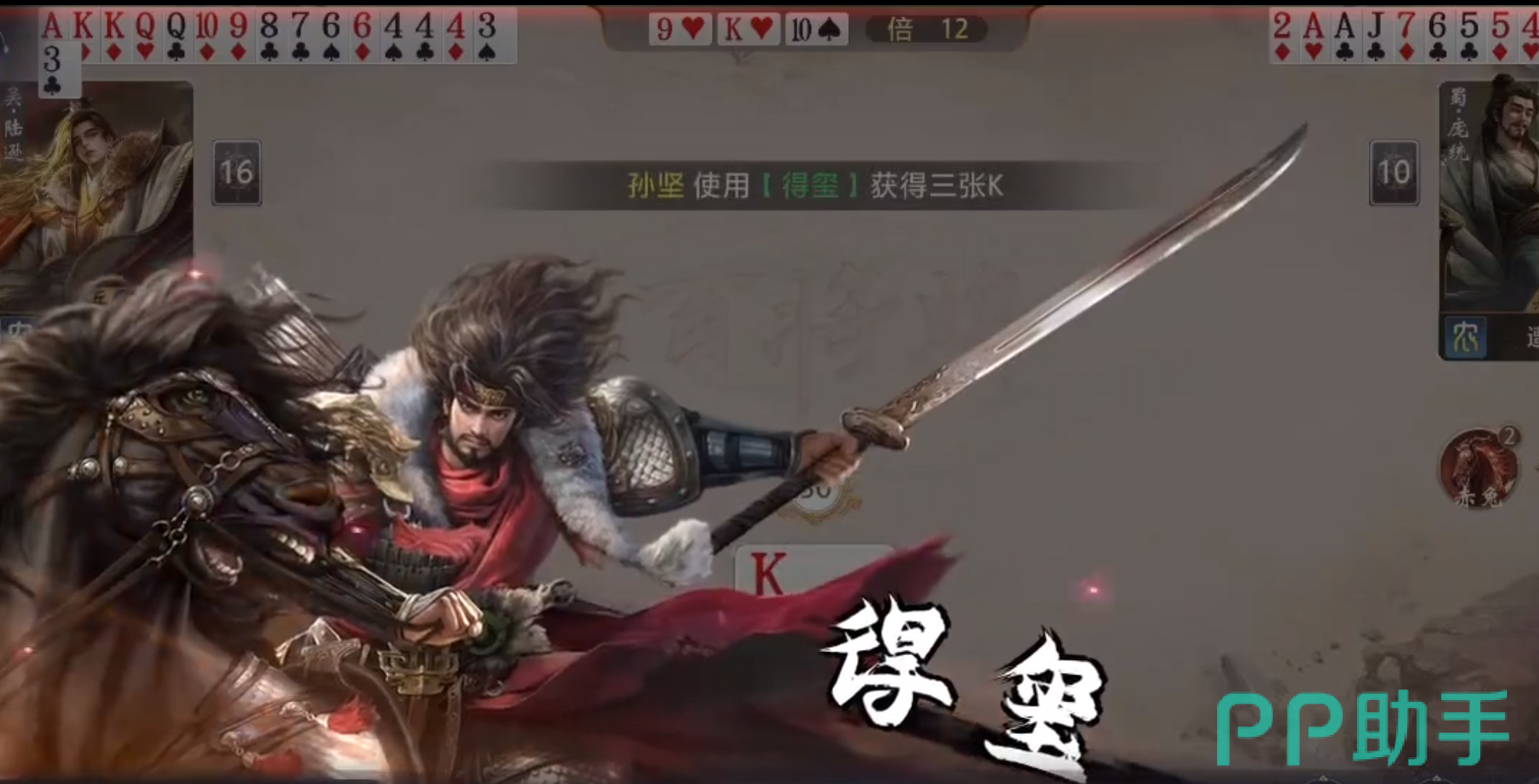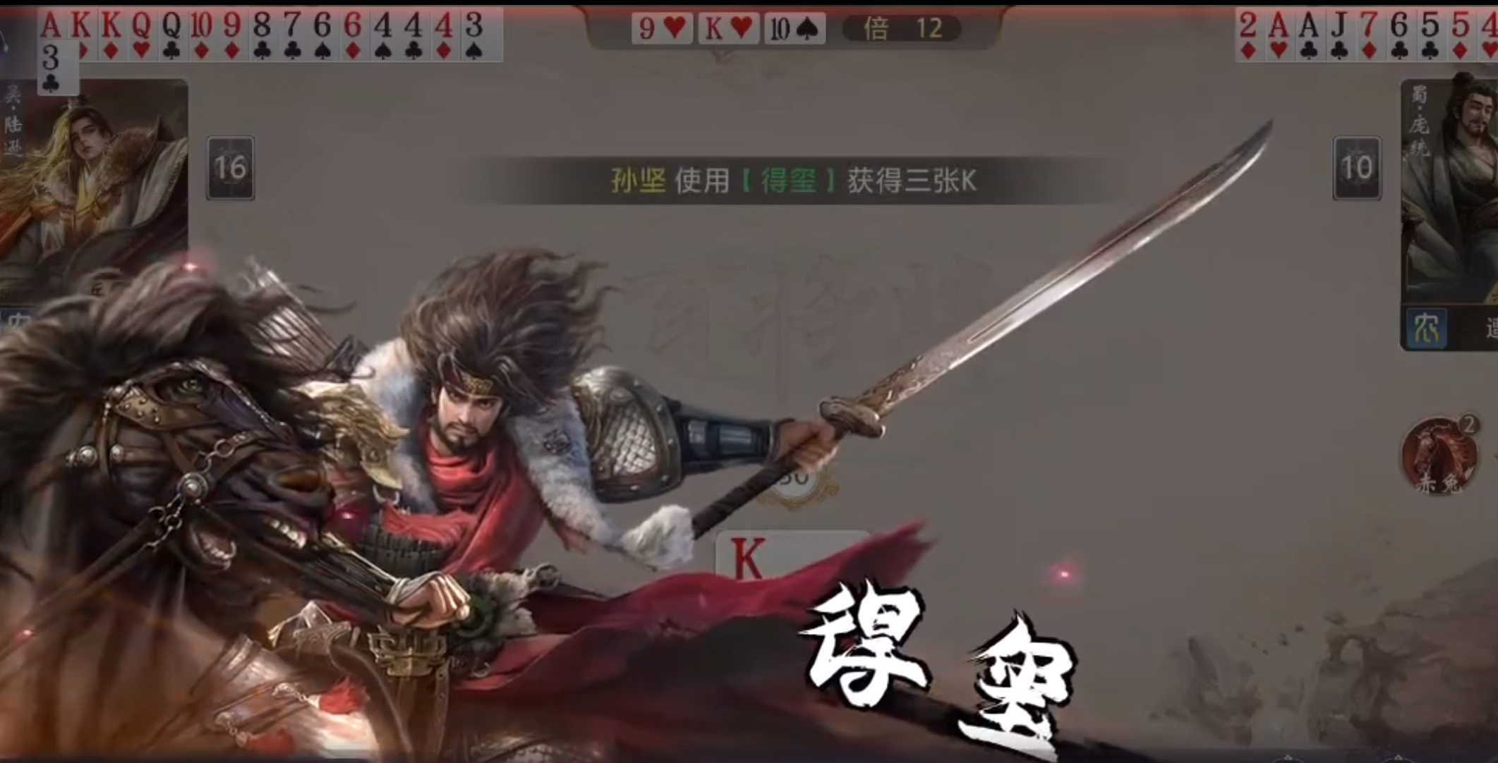 另外,在百将牌手游中,五星炸弹是可以克制王炸牌的,所以,当对局里存在孙坚时,我们就需要格外注意场上k牌的数量。如果到了清牌阶段场上仍有2张k牌还没有出现过的话,那么极有可能孙坚手上已经有五星炸弹了。所以孙坚是敌方对手的时候我们就需要尽可能多出对子或者是顺子,让孙坚的技能无法激活,或者是逼他打出手中的k牌,至少不要让他凑成五星炸弹的牌型。如果孙坚是友方的话,那我们就要打配合,主动出三带,帮助孙坚快速处理手中的三带牌型,尽早激活他的“得玺”技能。