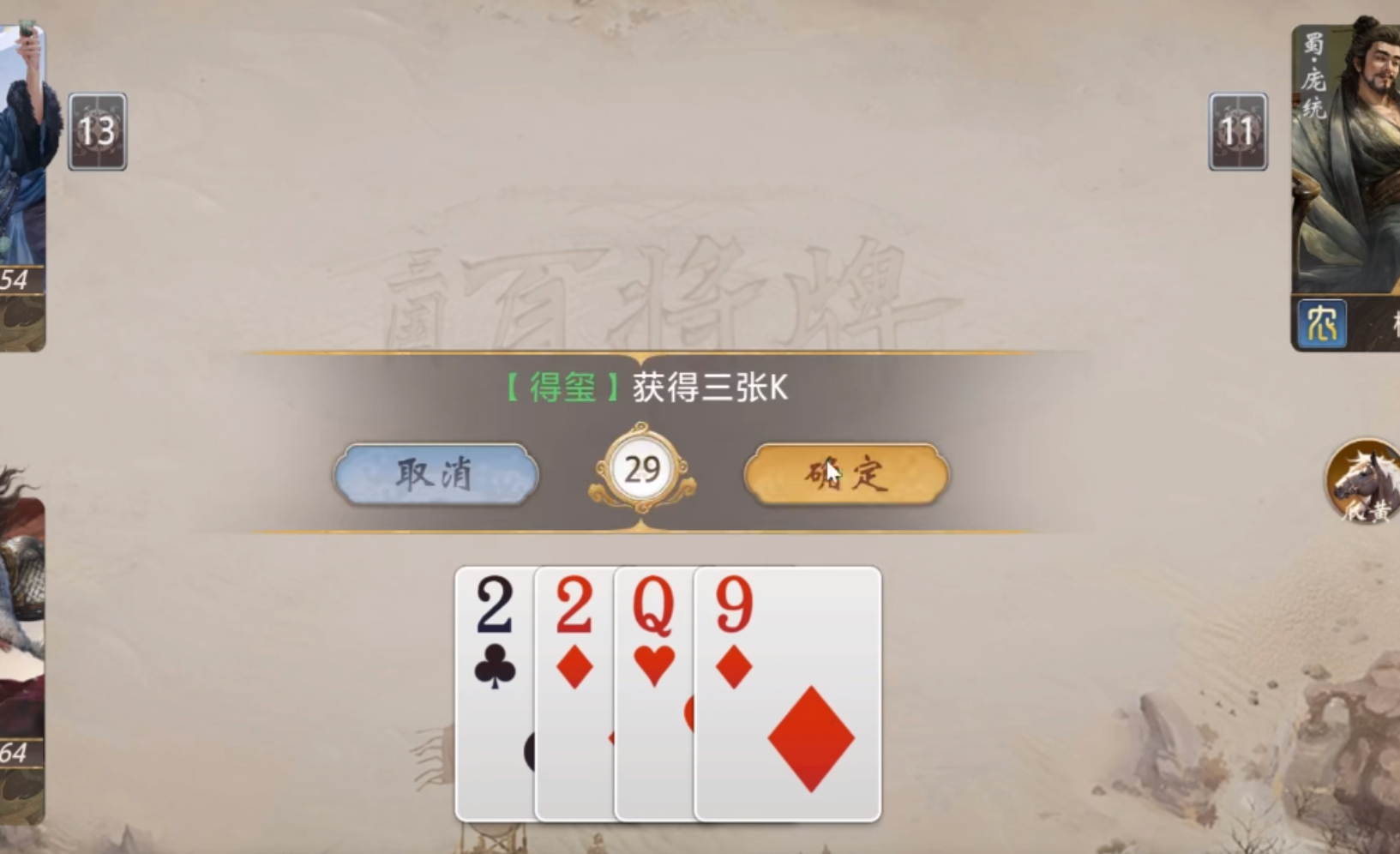 当然,凑k也不是盲目凑,我们要的是最终的控场效果,如果我们在开局时手里就有单k或者是对k,而且零散牌比较少的话,那么可以考虑叫一波地主,有利于我们凑出更多的三带手牌。另外在清理散牌的时候要优先将飞机或者是三带打出去,这样就可以提早激活“得玺”效果,等到所有多余的散牌全部清理完毕之后,就可以发动“得玺”技能拿到三张k牌,凑出五张k的炸弹牌型,拿下最后的控场权!
