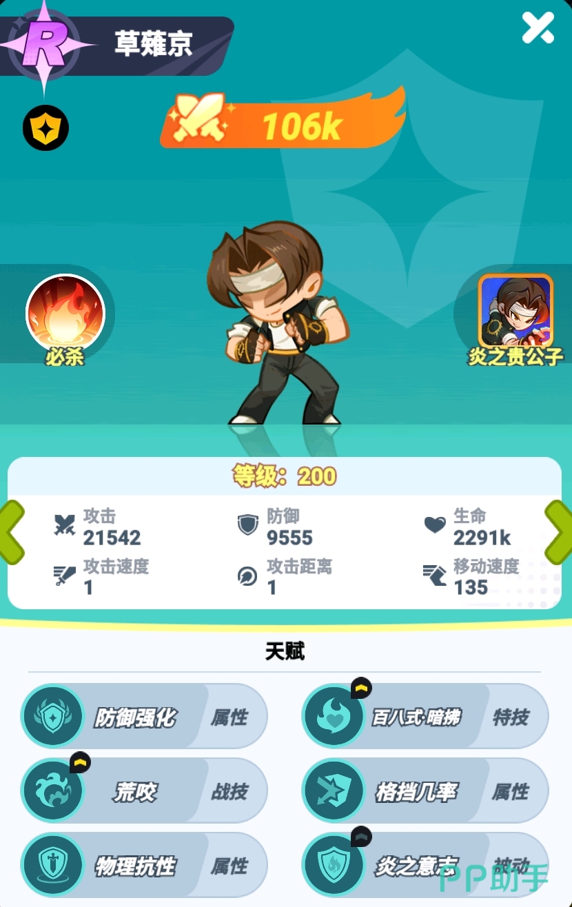 草薙京在游戏开局就会加入到大家的战队中,同时他也是开荒期很好用的前排,在实战中不仅能打出较高的伤害,还能轻松地压缩敌方的阵型。而且一旦他升到SR,在强度这一块也不会比初始SR级的角色低上多少,培养好后可用上非常久的时间。