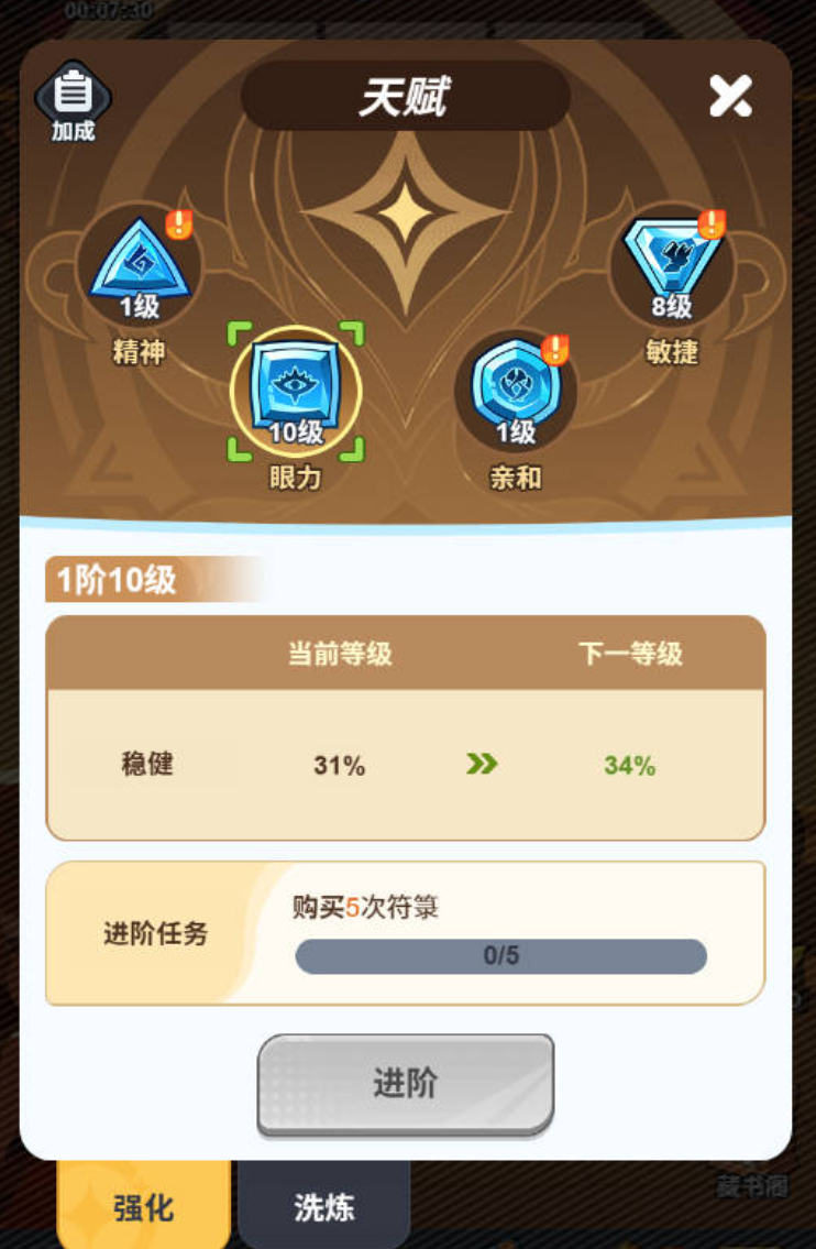 在天赋方面的话,升级是有讲究的,建议玩家先把眼力跟敏捷优先升级,毕竟这两个中的一个是将偷师失败的概率,一个减少被发现的可能。其实在这里会涉及到招式的熟练度,玩家还能够让分解招式获得更多的古币,当然还有一点比较重要,那就是符篆属性,其实符篆能够有效的提高偷师,毕竟它能够有效地拿到某类招式的概率,通常商店能购买,开权益卡也能够获得,不过玩家要注意的就是,部分稀有的招式只能够靠特定的符篆。