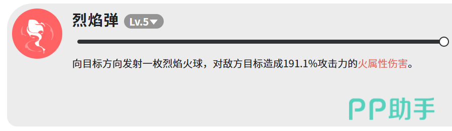 【烈焰弹】为直线型远程技能,发射一枚火球命中指定目标,造成191.1%攻击力的火属性伤害。无附加状态或机制效果,专注提供中距离稳定输出支持,适用于走位调整、补刀或牵制等战术需求。
