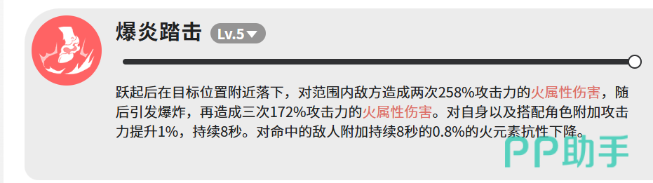 【爆炎踏击】作为核心AOE技能,执行过程包含三段伤害结构:起跳阶段对目标区域造成两次258%攻击力的火属性打击;落地瞬间触发范围爆炸,追加三次172%攻击力的火属性伤害。整套连招理论总倍率可观。此外,施放后为自身及绑定角色提供8秒内1%攻击力增益;同时使被命中的敌方单位火元素抗性降低0.8%,持续时间同步为8秒。该减抗效果虽单次数值有限,但在火队协同体系中具备稳定叠加价值。