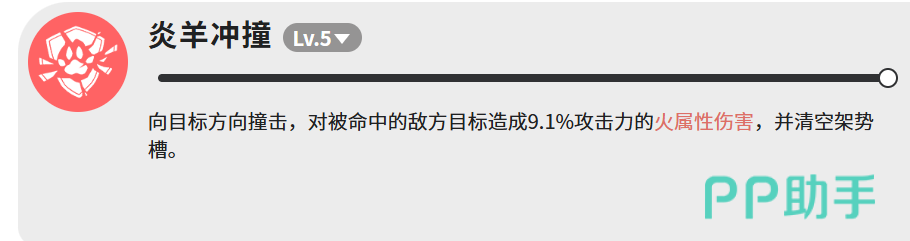 【炎羊冲撞】基础伤害仅为9.1%攻击力,为四技中最低,但具备独特机制价值:命中即强制清空目标架势槽。此效果可高效促成敌人进入硬直、破防等易伤状态,为后续连段创造理想窗口,在控场与节奏衔接层面具有不可替代性。