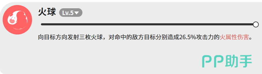 “火球”为三段式基础攻击技能,一次性投射三枚火球,每枚造成26.5%攻击力的火属性伤害,合计约79.5%。该技能冷却短、释放快,主要用于衔接技能空档、补充伤害或执行低风险补刀操作,操作门槛极低。
