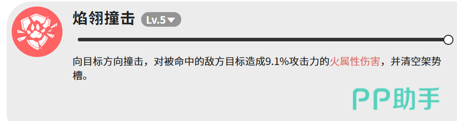 “焰翎撞击”的核心价值不在于输出,其9.1%攻击力的火属性伤害仅为附带效果。该技能的关键机制是强制清空目标架势槽,触发硬直状态,为后续高倍率技能创造理想输出窗口,属于典型的功能型前置技,需配合连招体系使用方能发挥最大效用。