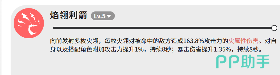 其主力输出技能“焰翎利箭”可向前发射多支火翎,每支命中目标造成163.8%攻击力的火属性伤害。该技能兼具功能性:成功释放后,焰翎龙自身及当前编队中的协同角色均可获得攻击力+1%、暴击伤害+1.35%的增益效果,持续时间均为8秒。虽单次增幅数值有限,但在高频施放节奏下可形成显著的属性叠加收益。