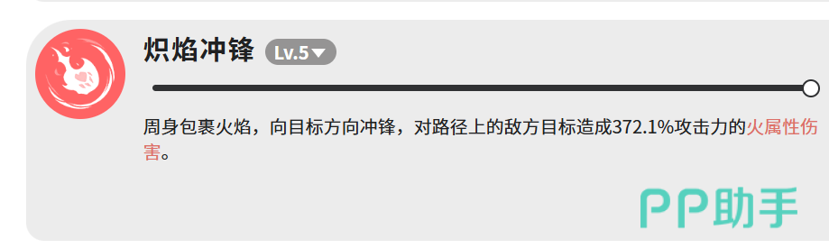 “炽焰冲锋”为典型的突进型范围技,焰翎龙裹挟烈焰直线冲刺,对路径上所有敌人造成372.1%攻击力的火属性伤害。该技能倍率在全技能体系中位居前列,兼具高覆盖率与强打断能力,是应对复数敌人的高效清场手段。
