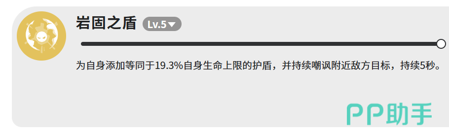 【岩固之盾】专注生存与战术牵引:施放瞬间生成相当于自身最大生命值19.3%的护盾,并激活5秒强制嘲讽效果,锁定周围敌方单位使其仅能攻击钻山蜥。这一机制使其成为高危副本或Boss战中的关键承伤节点,既保障队友输出环境稳定,又通过护盾延长前排站场时间。