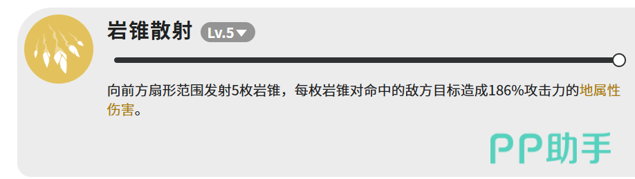 【岩锥散射】提供高效范围压制能力:向前方扇形区域发射5枚岩锥,每枚命中均造成186%攻击力的地属性伤害。当敌方密集站位时,多枚岩锥集中命中同一目标可形成可观的叠加伤害,是清理杂兵、压制群怪的核心清场技能。