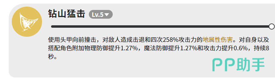 【钻山猛击】作为核心主动技,融合输出与增益双重作用:钻山蜥以头顶甲壳发起直线突进,命中目标后触发四段连续地属性伤害,每段均为258%攻击力;同时造成敌方击退,并为自身及协同作战角色叠加持续8秒的复合增益——物理防御与魔法防御各提升1.27%,攻击力同步增长0.6%。该效果虽单次增幅有限,但在多轮技能循环与多人组队场景下可实现有效叠加,显著增强持续作战韧性。
