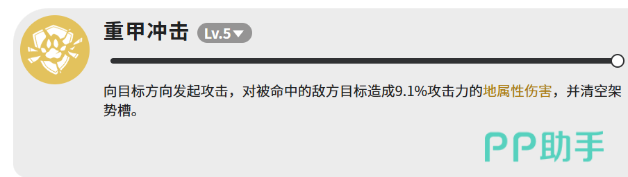 【重甲冲击】侧重战术控制而非数值输出:虽仅有9.1%攻击力的直接伤害,但具备清除敌方架势槽的关键机制。成功命中后将使目标陷入硬直状态,为队友创造无缝衔接连招、打出高倍率爆发的黄金窗口,是构建稳定控制链的重要一环。