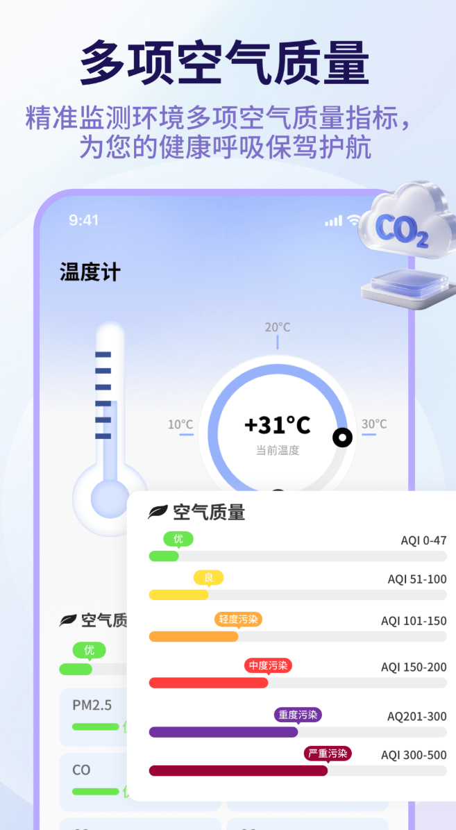支持室内外双场景温度同步显示,并叠加体感温度、相对湿度、PM2.5与AQI等多维环境指标。数据源采用多平台融合策略,交叉验证提升基准可信度。天气模块覆盖24小时逐小时预报及未来15日趋势,强对流、寒潮等高影响天气提前预警。工具箱集成水平仪、电子指南针、分贝噪音检测、角度与长度测算等功能,满足家居检修、装修测量、户外活动等多样化使用场景。